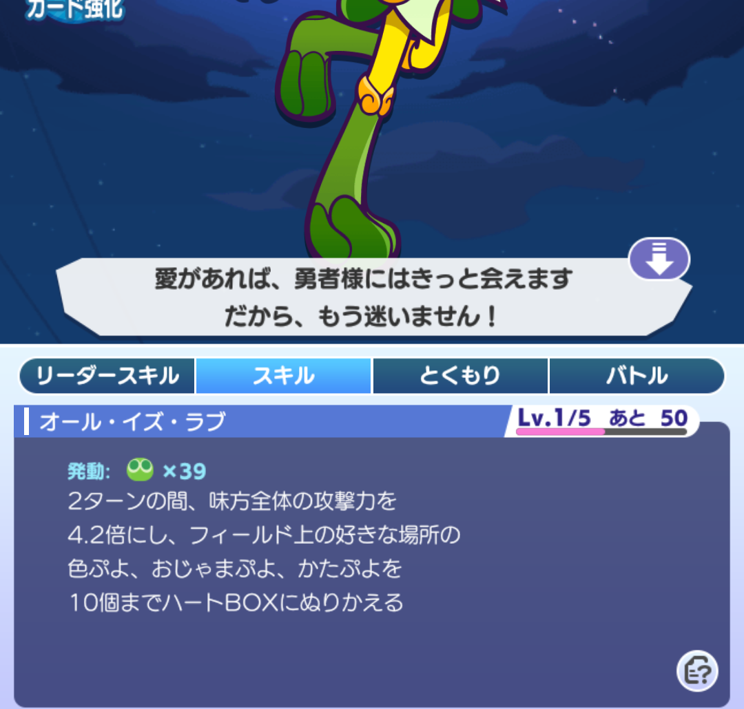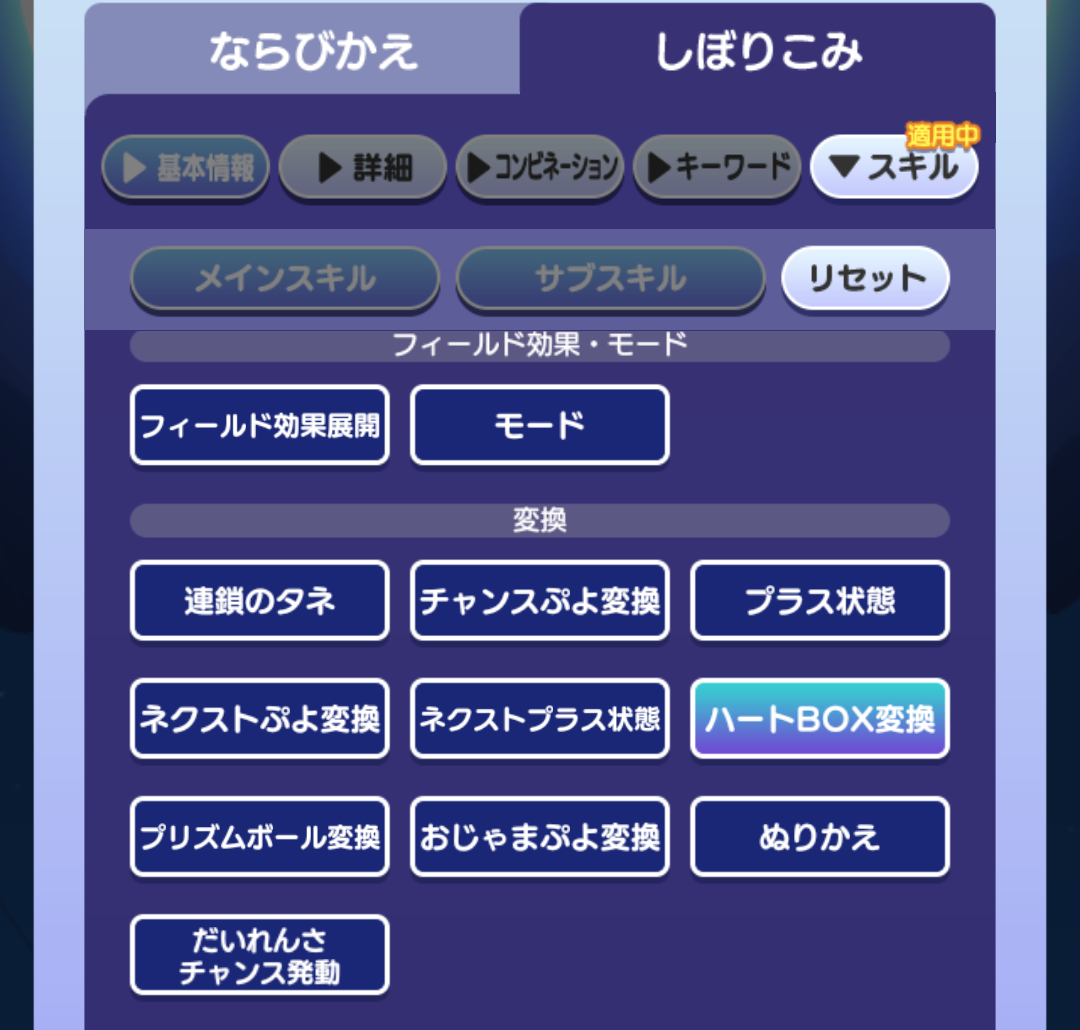 となっており、明らかに矛盾していて両立できません。 そこで、6枚のキャラの理想的な組み合わせを追求したくなってくるのですが、 簡単にはいきません。 アプリ内にスキルの検索機能はあるのですが、 「ハートBOX」については「ハートBOX変換」という項目しかなく、 これは「ハートBOX」を他のものに変えるのではなく、 他のものを「ハートBOX」に変換するスキルを表示するだけで、望む検索はできません。