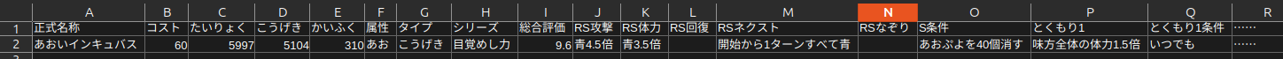 まず、思いつくのは、表計算アプリを使い、キャラの性能をテーブル化しておくことです。 例えば次のようです。